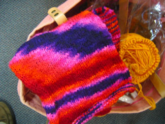 Lisa's finishing up an awesome looking pair of watermelon socks, using Dani's hand-dyed sock yarn. I gotta get some of that yarn!