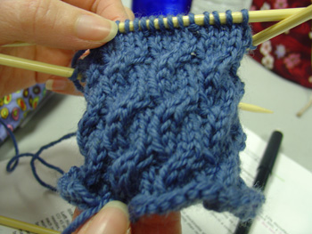 Molly's first cables! It's the Fetching mitts pattern and it's looking great.